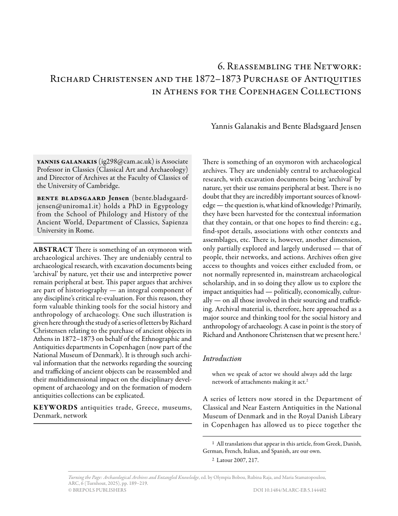 There is something of an oxymoron with archaeological archives. They are undeniably central to archaeological research, with excavation documents being ‘archival’ by nature, yet their use and interpretive power remain peripheral at best. This paper argues that archives are part of historiography — an integral component of any discipline’s critical re-evaluation. For this reason, they form valuable thinking tools for the social history and anthropology of archaeology. One such illustration is given here through the study of a series of letters by Richard Christensen relating to the purchase of ancient objects in Athens in 1872–1873 on behalf of the Ethnographic and Antiquities departments in Copenhagen (now part of the National Museum of Denmark). It is through such archival information that the networks regarding the sourcing and trafficking of ancient objects can be reassembled and their multidimensional impact on the disciplinary development of archaeology and on the formation of modern antiquities collections can be explicated.