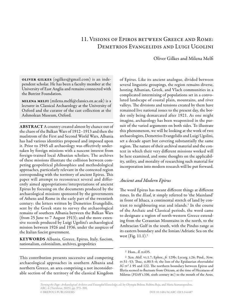 A country created almost by chance out of the chaos of the Balkan Wars of 1912–1913 and then the maelstrom of the First and Second World Wars, Albania has had various identities proposed and imposed upon it. Prior to 1945 all archaeology was effectively undertaken by foreign missions with a nascent interest from foreign-trained local Albanian scholars. The archives of these missions illustrate the collision between competing geopolitical philosophies and methodological approaches, particularly relevant in the contested region corresponding with the territory of ancient Epirus. This paper will attempt to reconstruct several and differently aimed appropriations/interpretations of ancient Epirus by focusing on the documents produced by the archaeological missions sponsored by the governments of Athens and Rome in the early part of the twentieth century: the letters written by Demetrios Evangelidis, sent by the Greek state to survey the archaeological remains of southern Albania between the Balkan Wars (from 25 June to 7 August 1913); and the more extensive records produced by Luigi Ugolini’s archaeological mission between 1926 and 1936, under the auspices of the Italian fascist government.