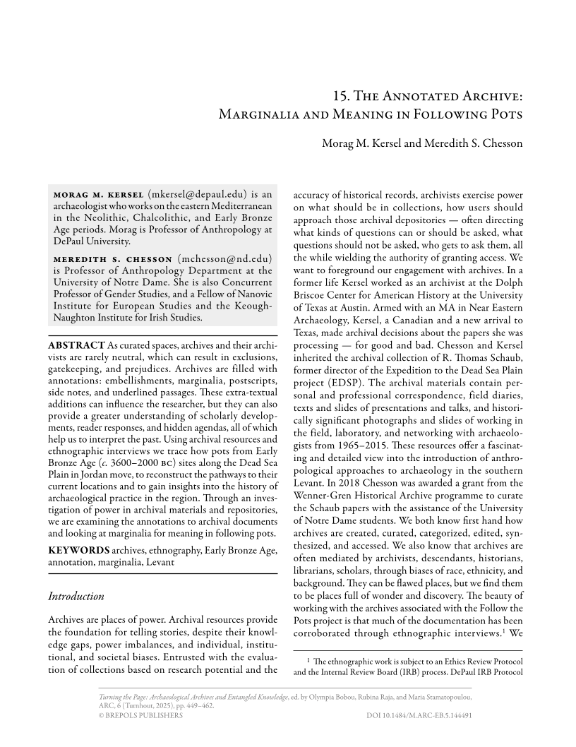 As curated spaces, archives and their archivists are rarely neutral, which can result in exclusions, gatekeeping, and prejudices. Archives are filled with annotations: embellishments, marginalia, postscripts, side notes, and underlined passages. These extra-textual additions can influence the researcher, but they can also provide a greater understanding of scholarly developments, reader responses, and hidden agendas, all of which help us to interpret the past. Using archival resources and ethnographic interviews we trace how pots from Early Bronze Age (c. 3600–2000 bc) sites along the Dead Sea Plain in Jordan move, to reconstruct the pathways to their current locations and to gain insights into the history of archaeological practice in the region. Through an investigation of power in archival materials and repositories, we are examining the annotations to archival documents and looking at marginalia for meaning in following pots.