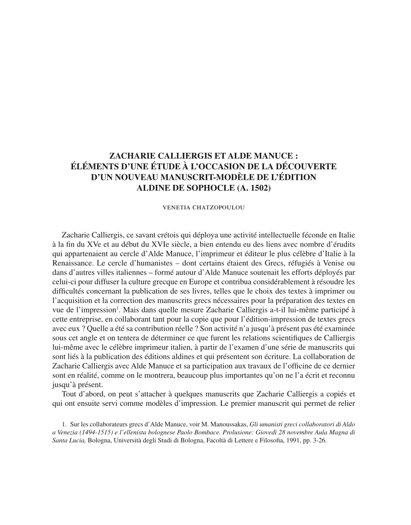 Zacharie Calliergis et Alde Manuce: éléments d’une étude à l’occasion de la découverte d’un nouveau manuscrit-modèle de l’édition aldine de Sophocle (a. 1502), Page 1 of 1