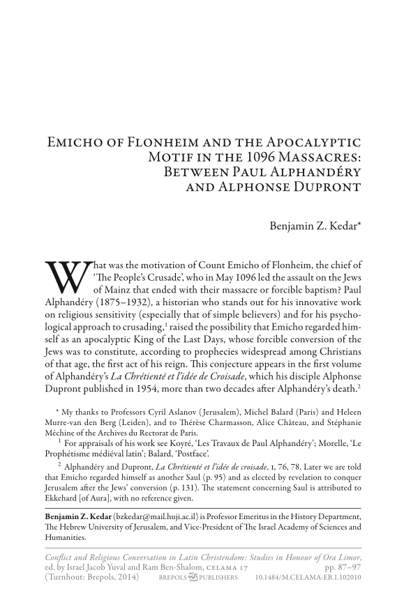 Emicho of Flonheim and the Apocalyptic Motif in the 1096 Massacres: Between Paul Alphandéry and Alphonse Dupront, Page 1 of 1