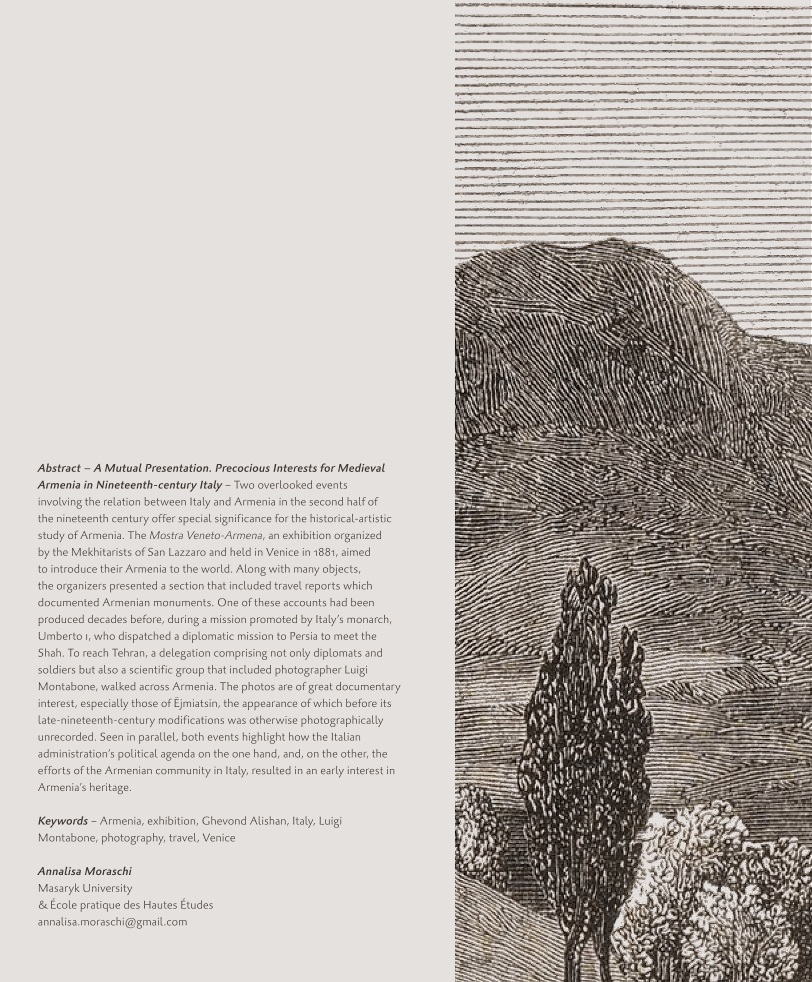 Two overlooked events involving the relation between Italy and Armenia in the second half of the nineteenth century offer special significance for the historical-artistic study of Armenia. The Mostra Veneto-Armena, an exhibition organized by the Mekhitarists of San Lazzaro and held in Venice in 1881, aimed to introduce their Armenia to the world. Along with many objects, the organizers presented a section that included travel reports which documented Armenian monuments. One of these accounts had been produced decades before, during a mission promoted by Italy’s monarch, Umberto i, who dispatched a diplomatic mission to Persia to meet the Shah. To reach Tehran, a delegation comprising not only diplomats and soldiers but also a scientific group that included photographer Luigi Montabone, walked across Armenia. The photos are of great documentary interest, especially those of Ējmiatsin, the appearance of which before its late-nineteenth-century modifications was otherwise photographically unrecorded. Seen in parallel, both events highlight how the Italian administration’s political agenda on the one hand, and, on the other, the efforts of the Armenian community in Italy, resulted in an early interest in Armenia’s heritage.