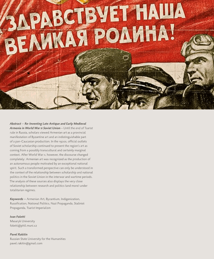 Until the end of Tsarist rule in Russia, scholars viewed Armenian art as a provincial manifestation of Byzantine art and an indistinguishable part of a pan-Caucasian production. In the 1920s, official outlets of Soviet scholarship continued to present the region’s art as coming from a possibly transcultural and certainly marginal context. After World War ii, however, the discourse changed completely: Armenian art was recognized as the production of an autonomous people motivated by an exceptional national spirit. Such a transformed perspective can only be understood in the context of the relationship between scholarship and national politics in the Soviet Union in the interwar and wartime periods. The analysis of these sources also displays the very close relationship between research and politics (and more) under totalitarian regimes.