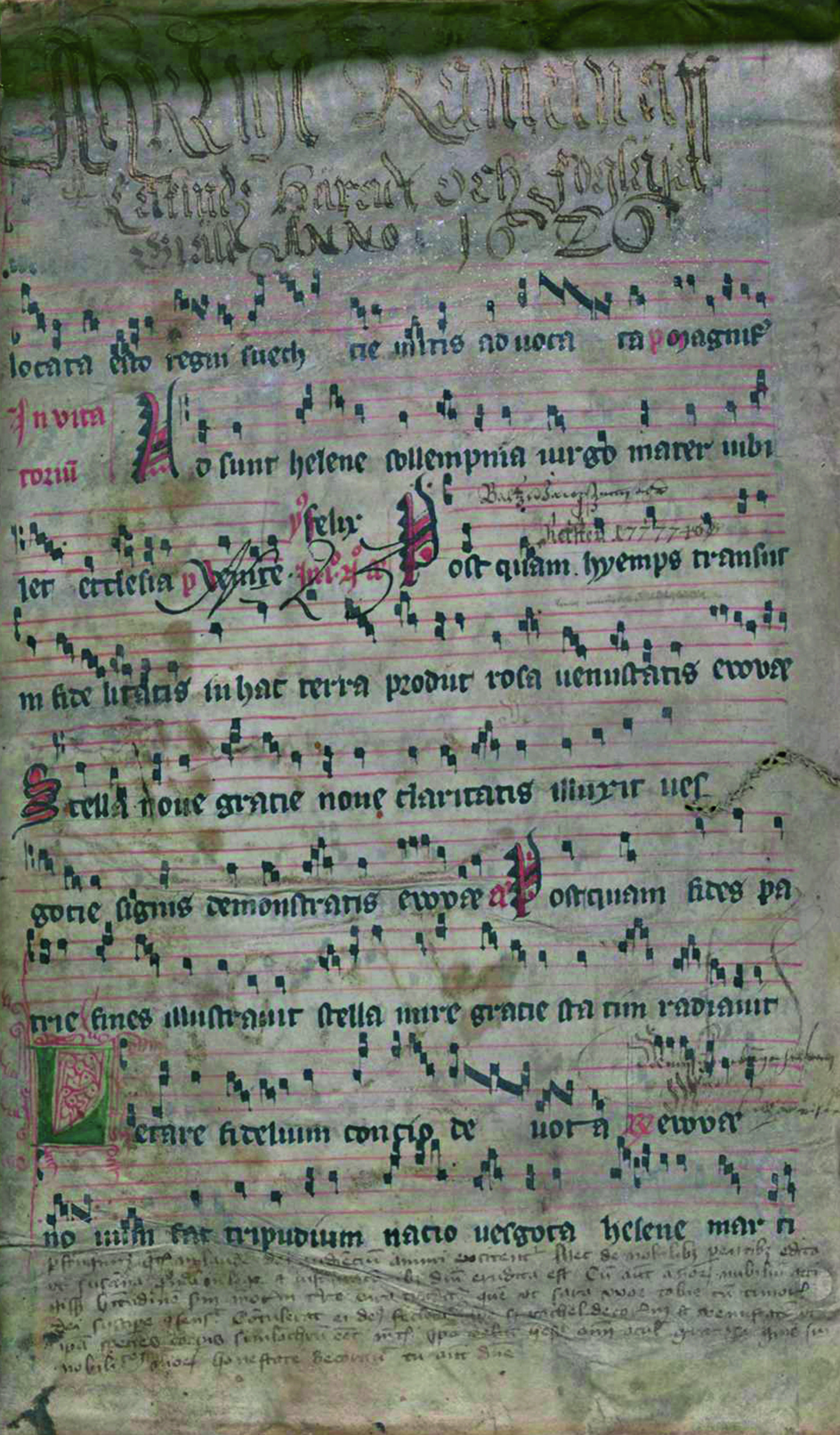 Figure 14.2. (second line from top of page), invitatory antiphon from the office for St Elin of Skövde. Stockholm, Riksarkivet (National archives) fr. 2119, Västergötlands handlingar, 1626:23:2. Fifteenth century. Reproduced with the permission of Riksarkivet.