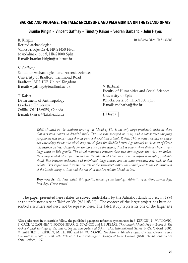 Talež, situated on the southern coast of the island of Vis, is the only large prehistoric enclosure there that has been subject to detailed study. The site was surveyed in 1994, and a sub-surface sampling programme was undertaken then as part of the Adriatic Islands Project. This exercise revealed an extended chronology for the site which may stretch from the Middle Bronze Age through to the onset of Greek colonisation on Vis. Uniquely for similar sites on the island, Talež is only a short distance from a very large cairn at Vela gomila. The visual connection between these two sites suggests that they are linked. Previously published project research on the islands of Hvar and Brač identified a complex, probably ritual, link between enclosures and individual, large cairns, and the data presented here adds to that debate. This paper also discusses the role of the settlement within the island prior to the establishment of the Greek colony at Issa and the role of syncretism within island society.