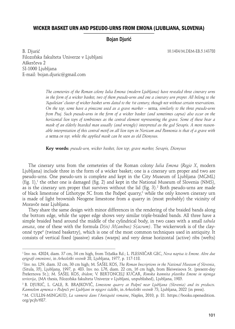 The cemeteries of the Roman colony Iulia Emona (modern Ljubljana) have revealed three cinerary urns in the form of a wicker basket, two of them pseudo-urns and one a cinerary urn proper. All belong to the ‘Aquileian’ cluster of wicker basket urns dated to the 1st century, though not without certain reservations. On the top, some have a pinecone used as a grave marker – sema, similarly to the three pseudo-urns from Ptuj. Such pseudo-urns in the form of a wicker basket (and sometimes capsa) also occur on the horizontal lion tops of tombstones as the central element representing the grave. Some of these bear a mask of an elderly bearded man usually (and wrongly) interpreted as the god Serapis. A more reasonable interpretation of this central motif on all lion tops in Noricum and Pannonia is that of a grave with a sema on top, while the applied mask can be seen as old Dionysus.