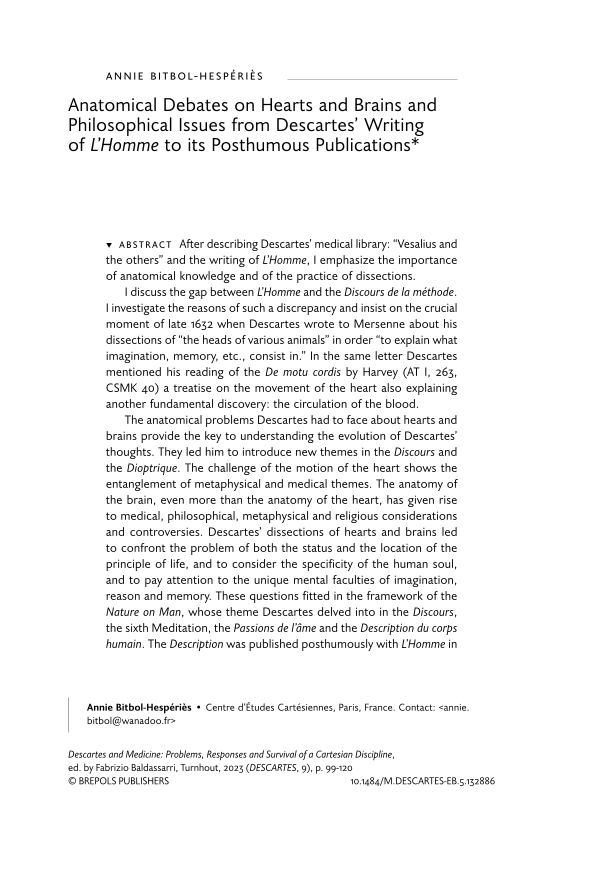 Anatomical Debates on Hearts and Brains and Philosophical Issues from Descartes’ Writing of L’Homme to its Posthumous Publications, Page 1 of 1