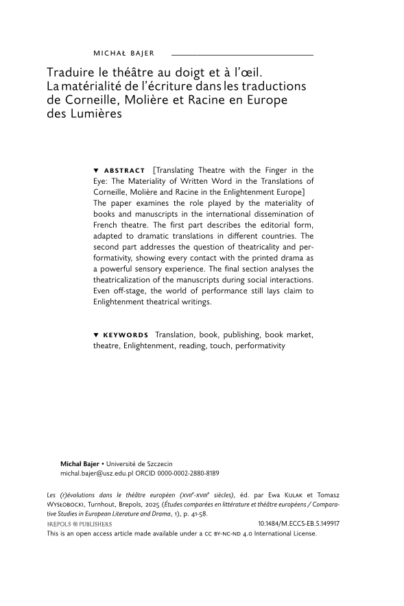 Traduire le théâtre au doigt et à l’œil. La matérialité de l’écriture dans les traductions de Corneille, Molière et Racine en Europe des Lumières, Page 1 of 1