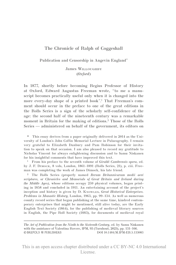 The Chronicle of Ralph of Coggeshall: Publication and Censorship in Angevin England, Page 1 of 1