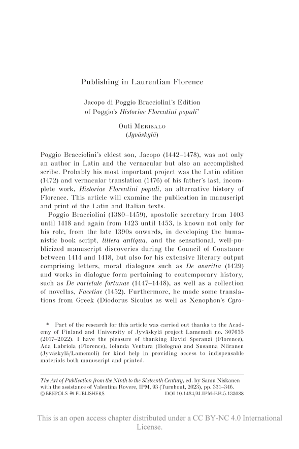 Publishing in Laurentian Florence: Jacopo di Poggio Bracciolini’s Edition of Poggio’s Historiae Florentini populi, Page 1 of 1