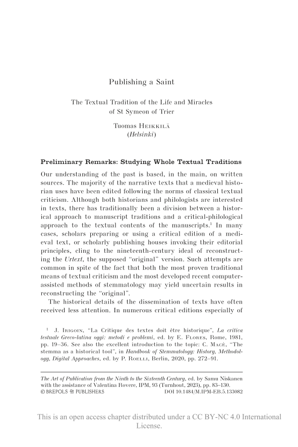 Publishing a Saint: The Textual Tradition of the Life and Miracles of St Symeon of Trier, Page 1 of 1