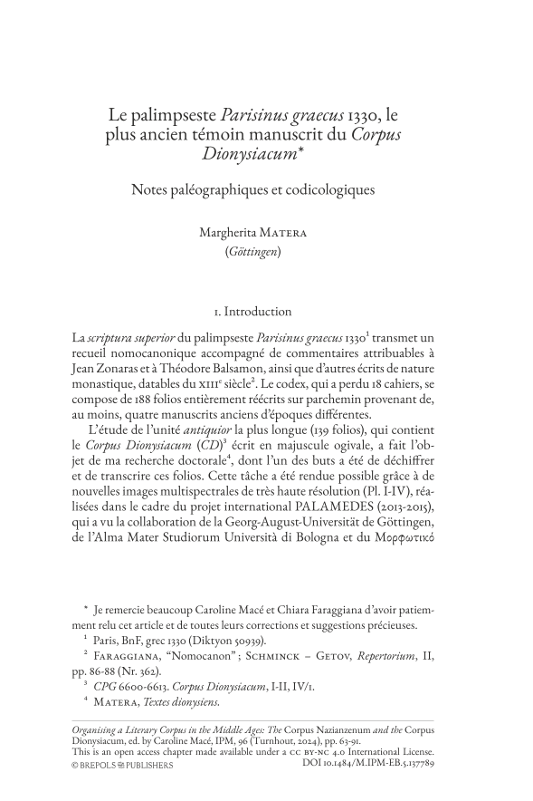Le palimpseste Parisinus graecus 1330, le plus ancien témoin manuscrit du Corpus Dionysiacum. Notes paléographiques et codicologiques, Page 1 of 1