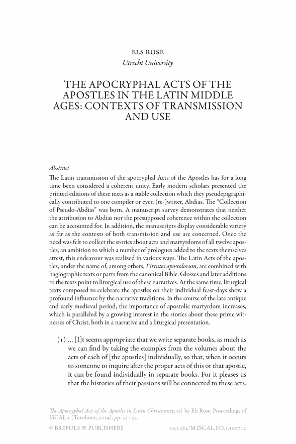 ,The Latin transmission of the apocryphal Acts of the Apostles has for a long time been considered a coherent unity. Early modern scholars presented the printed editions of these texts as a stable collection which they pseudepigraphically contributed to one compiler or even (re‑)writer, Abdias. The “Collection of Pseudo-Abdias” was born. A manuscript survey demonstrates that neither the attribution to Abdias nor the presupposed coherence within the collection can be accounted for. In addition, the manuscripts display considerable variety as far as the contexts of both transmission and use are concerned. Once the need was felt to collect the stories about acts and martyrdoms of all twelve apostles, an ambition to which a number of prologues added to the texts themselves attest, this endeavour was realized in various ways. The Latin Acts of the apostles, under the name of, among others, Virtutes apostolorum, are combined with hagiographic texts or parts from the canonical Bible. Glosses and later additions to the texts point to liturgical use of these narratives. At the same time, liturgical texts composed to celebrate the apostles on their individual feast-days show a profound influence by the narrative traditions. In the course of the late antique and early medieval period, the importance of apostolic martyrdom increases, which is paralleled by a growing interest in the stories about these prime witnesses of Christ, both in a narrative and a liturgical presentation.