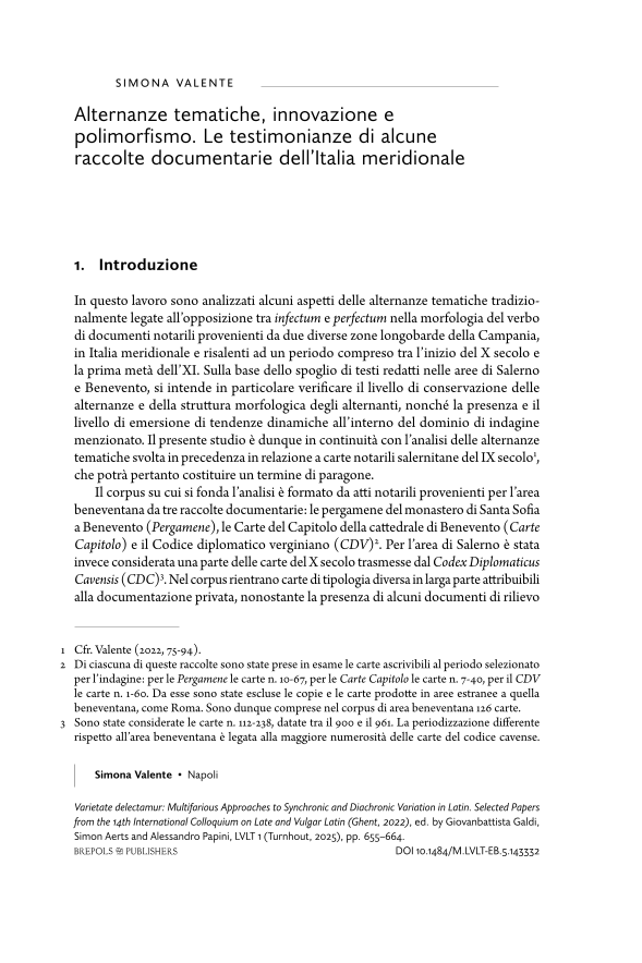 This paper analyses the stem alternations traditionally linked to the opposition infectum vs. perfectum in the verb morphology of notarial documents from two different Lombard areas of Campania in southern Italy and dating from the beginning of the tenth century and the first half of the eleventh. In the framework of a remarkable continuity with previous stages of the language, which confirms the conservative character of the verb morphology often observed in late Latin texts, the analysis allows us to observe some cases displaying overabundance in the realisation of perfect alternants and/or other deviations from ‘classical’ Latin. On this occasion, special attention is firstly devoted to the polymorphism observed in the perfect stem of some irregular verbs, such as offero, and of verbs with reduplicative perfect stem, in particular vendo. Moreover, through the analysis of the verb prehendo and some of its compounds, some traces of the expansion of the -s- perfect stem verb class are examined. Such phenomena, that show interesting potential connection with Romance outcomes, can be analysed in the light both of paradigmatic factors and external, mainly stylistic factors.