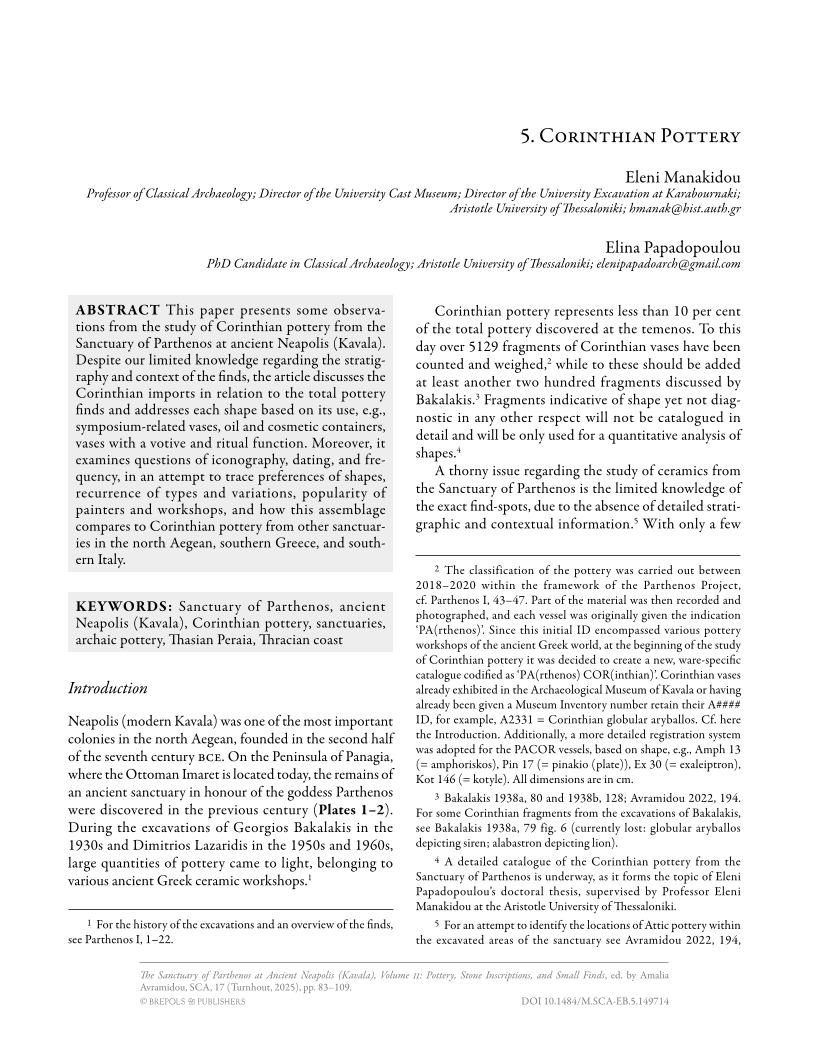 This paper presents some observations from the study of Corinthian pottery from the Sanctuary of Parthenos at ancient Neapolis (Kavala). Despite our limited knowledge regarding the stratigraphy and context of the finds, the article discusses the Corinthian imports in relation to the total pottery finds and addresses each shape based on its use, e.g., symposium-related vases, oil and cosmetic containers, vases with a votive and ritual function. Moreover, it examines questions of iconography, dating, and frequency, in an attempt to trace preferences of shapes, recurrence of types and variations, popularity of painters and workshops, and how this assemblage compares to Corinthian pottery from other sanctuaries in the north Aegean, southern Greece, and southern Italy.