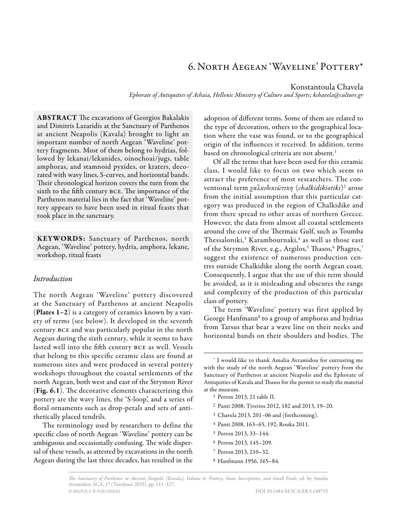 The excavations of Georgios Bakalakis and Dimitris Lazaridis at the Sanctuary of Parthenos at ancient Neapolis (Kavala) brought to light an important number of north Aegean ‘Waveline’ pottery fragments. Most of them belong to hydrias, followed by lekanai/lekanides, oinochoai/jugs, table amphoras, and stamnoid pyxides, or kraters, decorated with wavy lines, S-curves, and horizontal bands. Their chronological horizon covers the turn from the sixth to the fifth century bce. The importance of the Parthenos material lies in the fact that ‘Waveline’ pottery appears to have been used in ritual feasts that took place in the sanctuary.