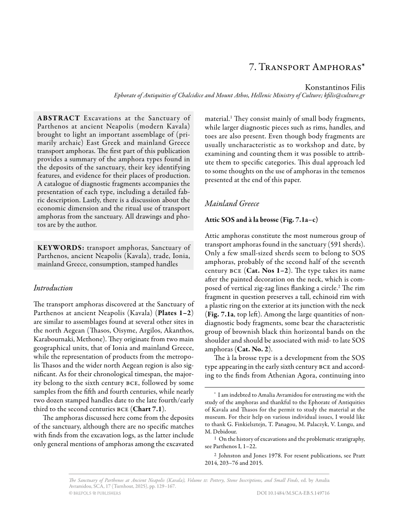 Excavations at the Sanctuary of Parthenos at ancient Neapolis (modern Kavala) brought to light an important assemblage of (primarily archaic) East Greek and mainland Greece transport amphoras. The first part of this publication provides a summary of the amphora types found in the deposits of the sanctuary, their key identifying features, and evidence for their places of production. A catalogue of diagnostic fragments accompanies the presentation of each type, including a detailed fabric description. Lastly, there is a discussion about the economic dimension and the ritual use of transport amphoras from the sanctuary. All drawings and photos are by the author.