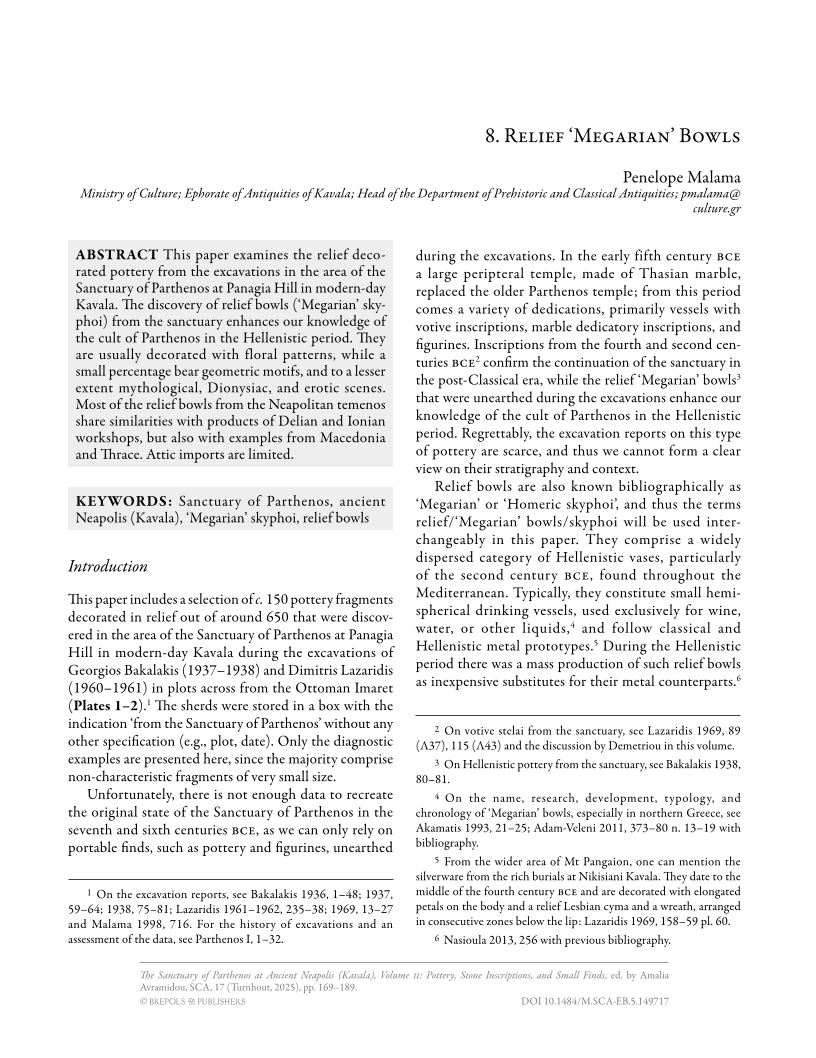 This paper examines the relief decorated pottery from the excavations in the area of the Sanctuary of Parthenos at Panagia Hill in modern-day Kavala. The discovery of relief bowls (‘Megarian’ skyphoi) from the sanctuary enhances our knowledge of the cult of Parthenos in the Hellenistic period. They are usually decorated with floral patterns, while a small percentage bear geometric motifs, and to a lesser extent mythological, Dionysiac, and erotic scenes. Most of the relief bowls from the Neapolitan temenos share similarities with products of Delian and Ionian workshops, but also with examples from Macedonia and Thrace. Attic imports are limited.