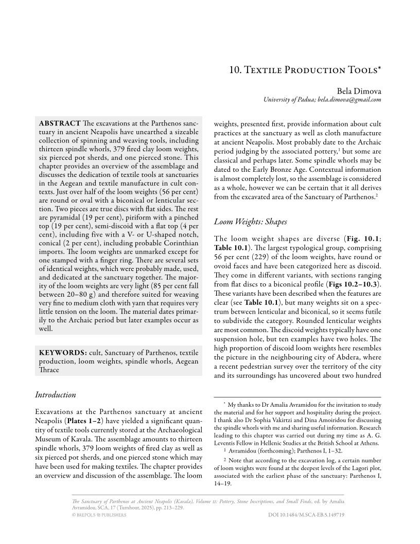 The excavations at the Parthenos sanctuary in ancient Neapolis have unearthed a sizeable collection of spinning and weaving tools, including thirteen spindle whorls, 379 fired clay loom weights, six pierced pot sherds, and one pierced stone. This chapter provides an overview of the assemblage and discusses the dedication of textile tools at sanctuaries in the Aegean and textile manufacture in cult contexts. Just over half of the loom weights (56 per cent) are round or oval with a biconical or lenticular section. Two pieces are true discs with flat sides. The rest are pyramidal (19 per cent), piriform with a pinched top (19 per cent), semi-discoid with a flat top (4 per cent), including five with a V- or U-shaped notch, conical (2 per cent), including probable Corinthian imports. The loom weights are unmarked except for one stamped with a finger ring. There are several sets of identical weights, which were probably made, used, and dedicated at the sanctuary together. The majority of the loom weights are very light (85 per cent fall between 20–80 g) and therefore suited for weaving very fine to medium cloth with yarn that requires very little tension on the loom. The material dates primarily to the Archaic period but later examples occur as well.