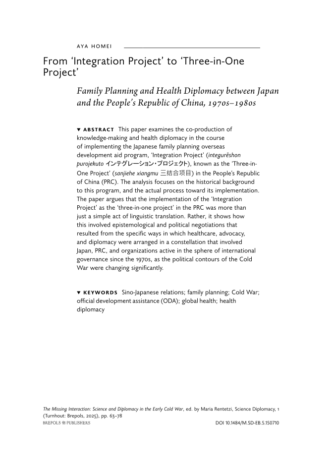 From ‘Integration Project’ to ‘Three-in-One Project’. Family Planning and Health Diplomacy between Japan and the People’s Republic of China, 1970s–1980s, Page 1 of 1