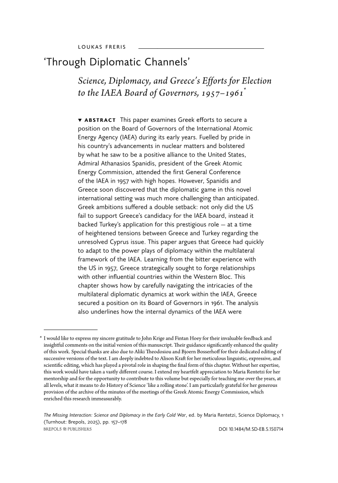 ‘Through Diplomatic Channels’. Science, Diplomacy, and Greece’s Efforts for Election to the IAEA Board of Governors, 1957–1961 * , Page 1 of 1