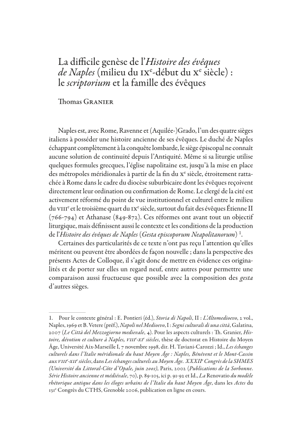 La difficile genèse de l’Histoire des évêques de Naples (milieu du ix e-début du x e siècle): le scriptorium et la famille des évêques, Page 1 of 1