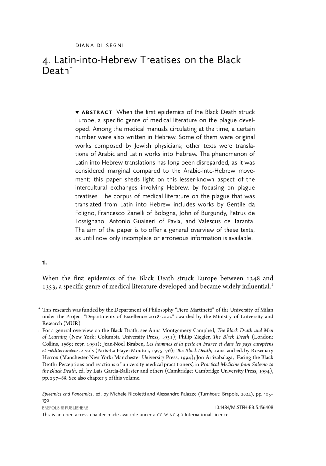 When the first epidemics of the Black Death struck Europe, a specific genre of medical literature on the plague developed. Among the medical manuals circulating at the time, a certain number were also written in Hebrew. Some of them were original works composed by Jewish physicians; other texts were translations of Arabic and Latin works into Hebrew. The phenomenon of Latin-into-Hebrew translations has long been disregarded, as it was considered marginal compared to the Arabic-into-Hebrew movement; this paper sheds light on this lesser-known aspect of the intercultural exchanges involving Hebrew, by focusing on plague treatises. The corpus of medical literature on the plague that was translated from Latin into Hebrew includes works by Gentile da Foligno, Francesco Zanelli of Bologna, John of Burgundy, Petrus de Tossignano, Antonio Guaineri of Pavia, and Valescus de Taranta. The aim of the paper is to offer a general overview of these texts, as until now only incomplete or erroneous information is available.