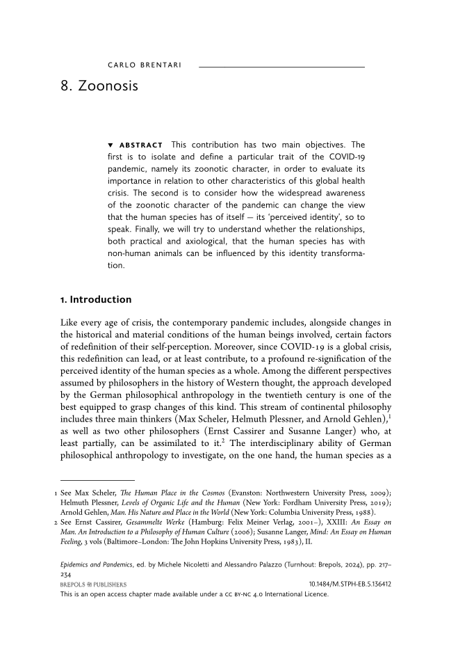 This contribution has two main objectives. The first is to isolate and define a particular trait of the COVID-19 pandemic, namely its zoonotic character, in order to evaluate its importance in relation to other characteristics of this global health crisis. The second is to consider how the widespread awareness of the zoonotic character of the pandemic can change the view that the human species has of itself — its ‘perceived identity’, so to speak. Finally, we will try to understand whether the relationships, both practical and axiological, that the human species has with non-human animals can be influenced by this identity transformation.