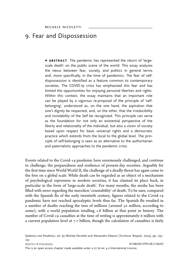 The pandemic has represented the return of ‘large-scale death’ on the public scene of the world. This essay analyzes the nexus between fear, society, and politics in general terms and, more specifically, in the time of pandemics. The fear of self-dispossession is identified as a feature common to contemporary societies. The COVID-19 crisis has emphasized this fear and has limited the opportunities for enjoying personal liberties and rights. Within this context, the essay maintains that an important role can be played by a vigorous re-proposal of the principle of ‘self-belonging’, understood as, on the one hand, the aspiration that one’s dignity be respected, and, on the other, that the irreducibility and inviolability of the Self be recognized. This principle can serve as the foundation for not only an existential perspective of the liberty and relationality of the individual, but also a vision of society based upon respect for basic universal rights and a democratic practice which extends from the local to the global level. The principle of self-belonging is seen as an alternative to the authoritarian and paternalistic approaches to the pandemic crisis.