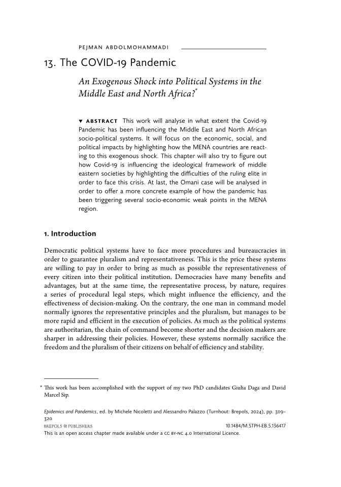 This work will analyse in what extent the Covid-19 Pandemic has been influencing the Middle East and North African socio-political systems. It will focus on the economic, social, and political impacts by highlighting how the MENA countries are reacting to this exogenous shock. This chapter will also try to figure out how Covid-19 is influencing the ideological framework of middle eastern societies by highlighting the difficulties of the ruling elite in order to face this crisis. At last, the Omani case will be analysed in order to offer a more concrete example of how the pandemic has been triggering several socio-economic weak points in the MENA region.