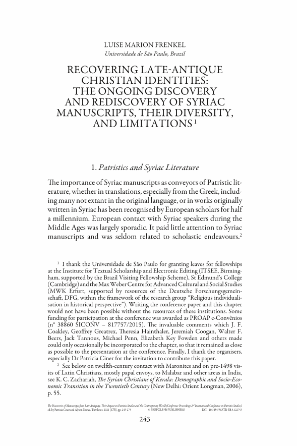 Recovering Late-Antique Christian Identities: The Ongoing Discovery and Rediscovery of Syriac Manuscripts, their Diversity, and Limitations, Page 1 of 1