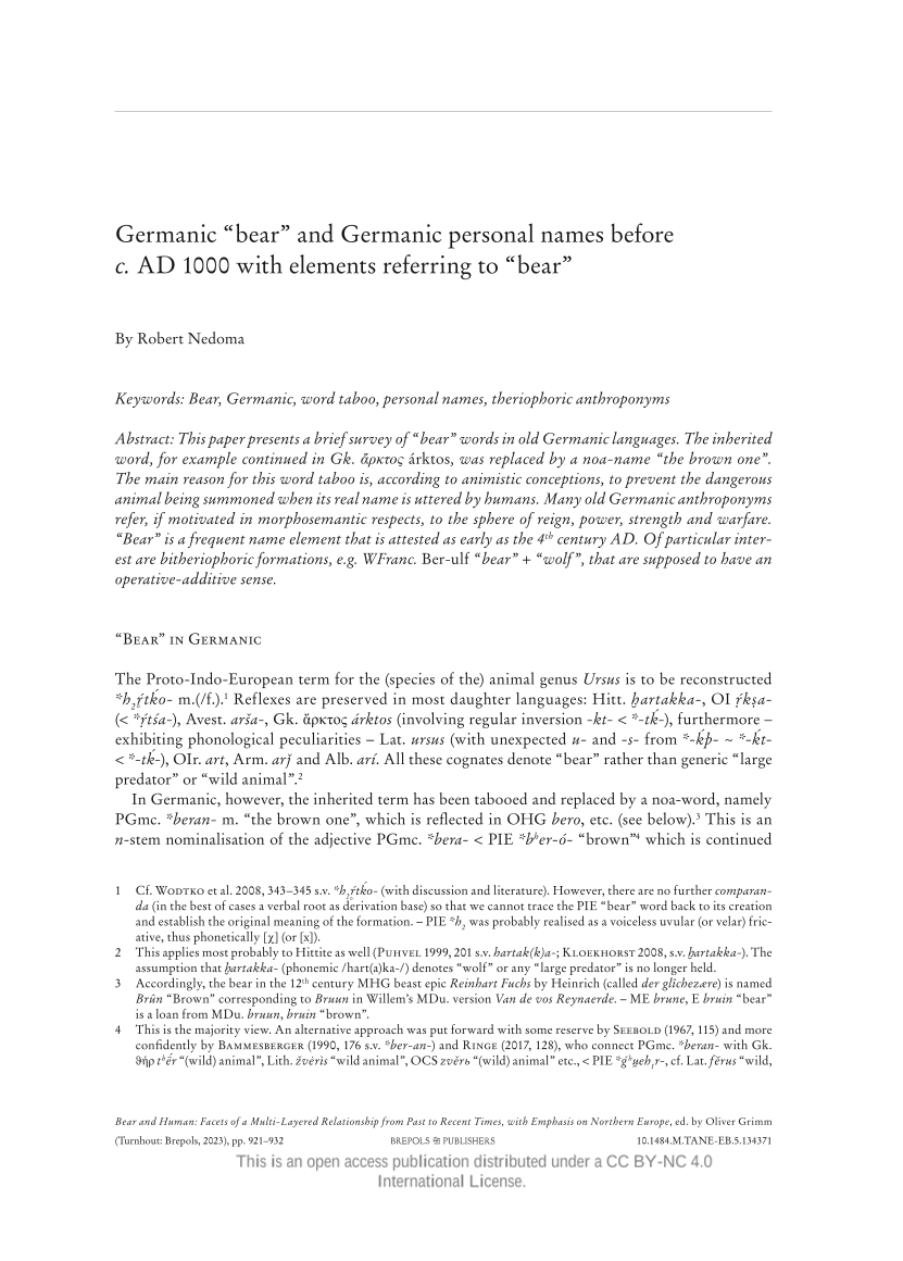 This paper presents a brief survey of “bear” words in old Germanic languages. The inherited word, for example continued in Gk. ἄρκτος árktos, was replaced by a noa-name “the brown one”. The main reason for this word taboo is, according to animistic conceptions, to prevent the dangerous animal being summoned when its real name is uttered by humans. Many old Germanic anthroponyms refer, if motivated in morphosemantic respects, to the sphere of reign, power, strength and warfare. “Bear” is a frequent name element that is attested as early as the 4th century AD. Of particular interest are bitheriophoric formations, e.g. WFranc. Ber-ulf “bear” + “wolf”, that are supposed to have an operative-additive sense.