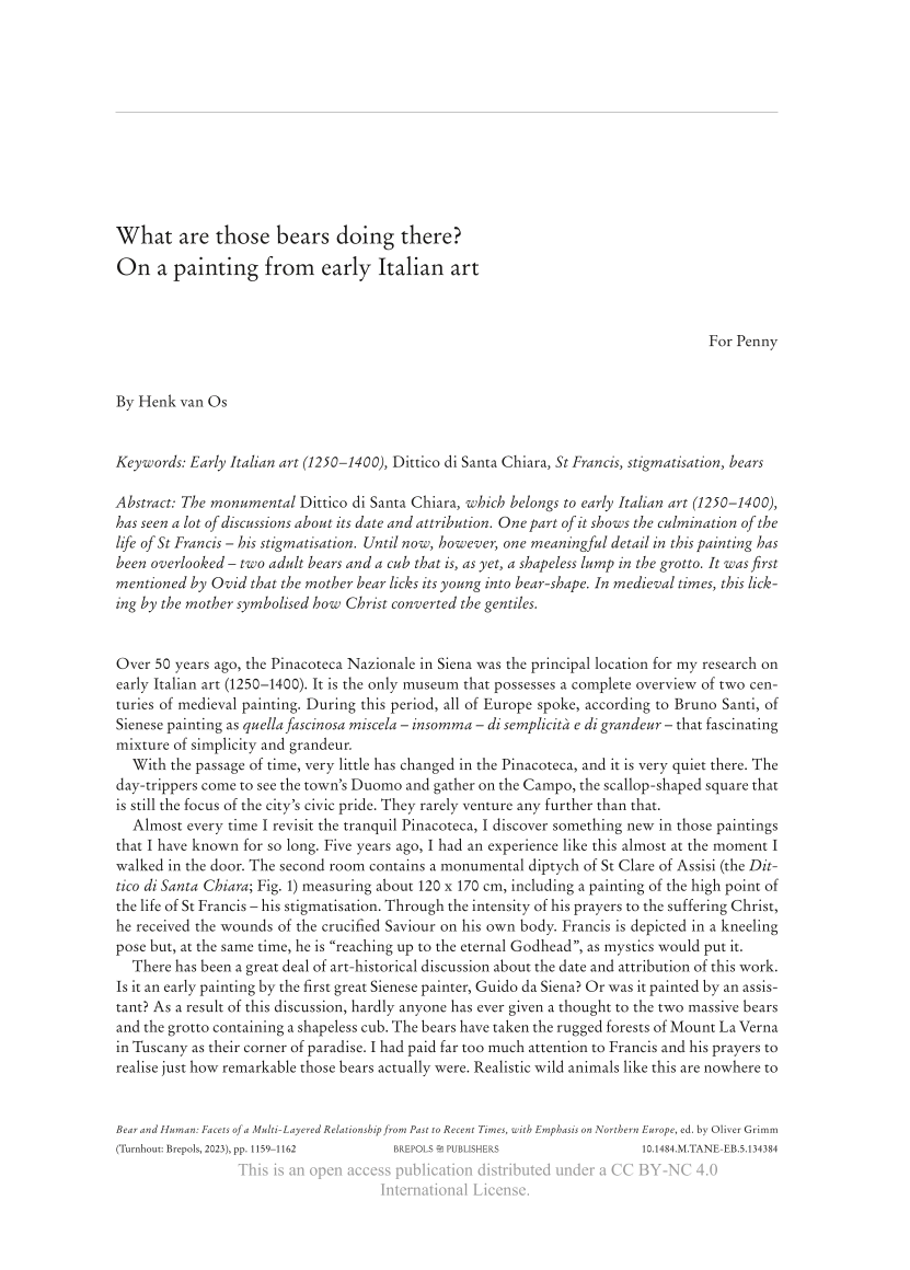 The monumental Dittico di Santa Chiara, which belongs to early Italian art (1250-1400), has seen a lot of discussions about its date and attribution. One part of it shows the culmination of the life of St Francis - his stigmatisation. Until now, however, one meaningful detail in this painting has been overlooked - two adult bears and a cub that is, as yet, a shapeless lump in the grotto. It was first mentioned by Ovid that the mother bear licks its young into bear-shape. In medieval times, this licking by the mother symbolised how Christ converted the gentiles.