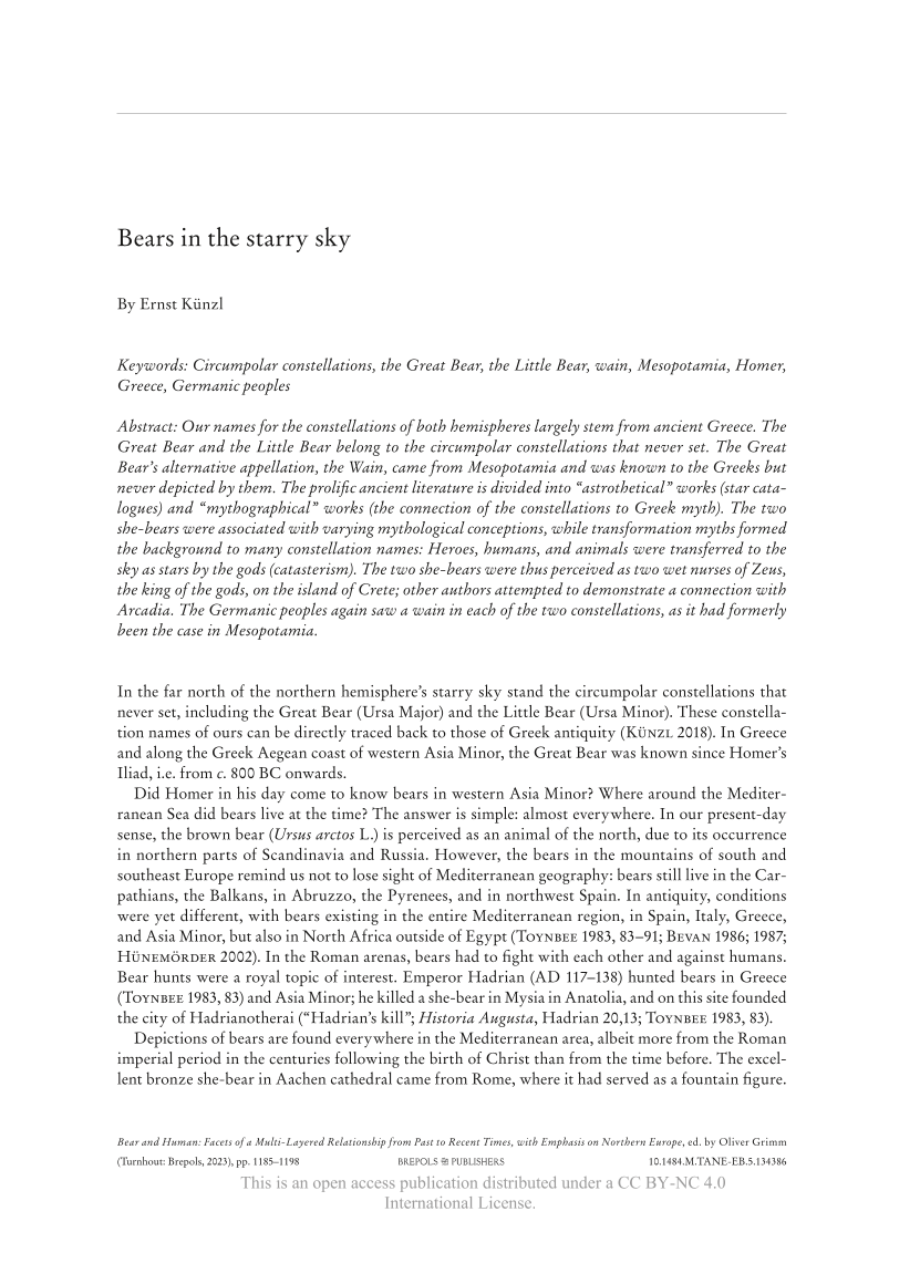Our names for the constellations of both hemispheres largely stem from ancient Greece. The Great Bear and the Little Bear belong to the circumpolar constellations that never set. The Great Bear’s alternative appellation, the Wain, came from Mesopotamia and was known to the Greeks but never depicted by them. The prolific ancient literature is divided into “astrothetical” works (star catalogues) and “mythographical” works (the connection of the constellations to Greek myth). The two she-bears were associated with varying mythological conceptions, while transformation myths formed the background to many constellation names: Heroes, humans, and animals were transferred to the sky as stars by the gods (catasterism). The two she-bears were thus perceived as two wet nurses of Zeus, the king of the gods, on the island of Crete; other authors attempted to demonstrate a connection with Arcadia. The Germanic peoples again saw a wain in each of the two constellations, as it had formerly been the case in Mesopotamia.
