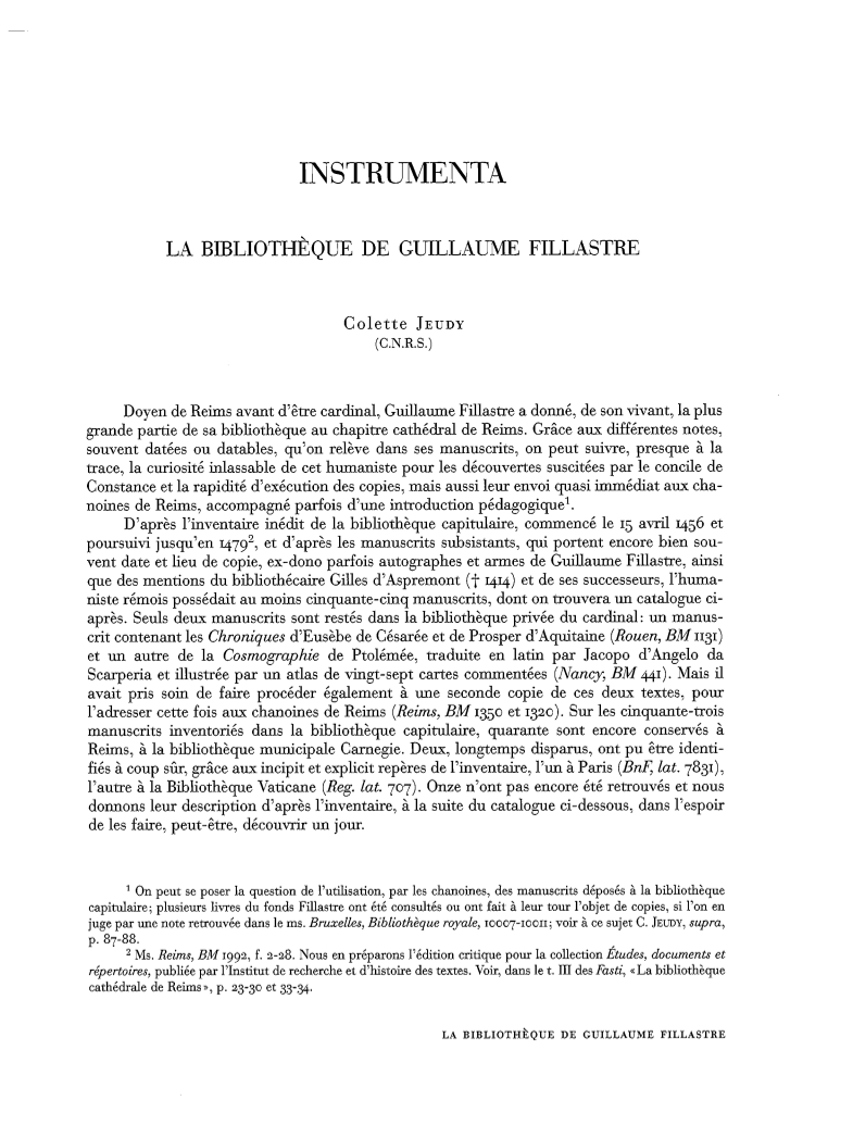 Doyen de Reims avant d’être cardinal, un des artisans, avec Pierre d’Ailly, de la résolution du Grand schisme d’Occident, Guillaume Fillastre a constitué, jusqu’à sa mort en 1428, une riche bibliothèque qui témoigne de sa formation d’humaniste et de son intérêt plus particulier pour la géographie de la tradition gréco-romaine. Son époque, qui est aussi celle du Pogge, voit le renouveau des études classiques s’imposer à toute l’Europe. À côté de la personnalité de l’érudit et de l’homme d’Église, on aborde ici les relations entre les premiers humanistes français et l’Italie, l’activité des philologues, les travaux des géographes et des cartographes dans les premières décennies du XVe siècle. Une place toute spéciale a été réservée à la Géographie de Ptolémée, dont la fortune, à la fin du moyen âge, a trouvé en Fillastre un de ses principaux vecteurs.