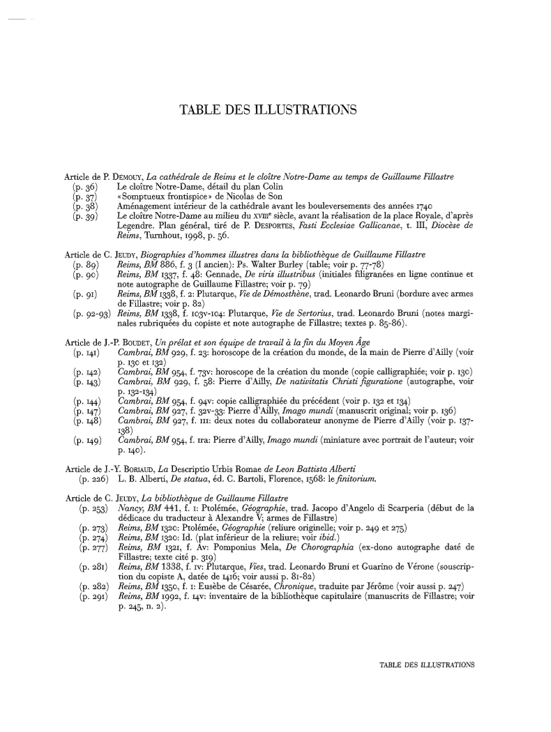 f Back matter (“Table des illustrations”, “Index des manuscrits cités”, “Index des noms”, “Table des matières”)