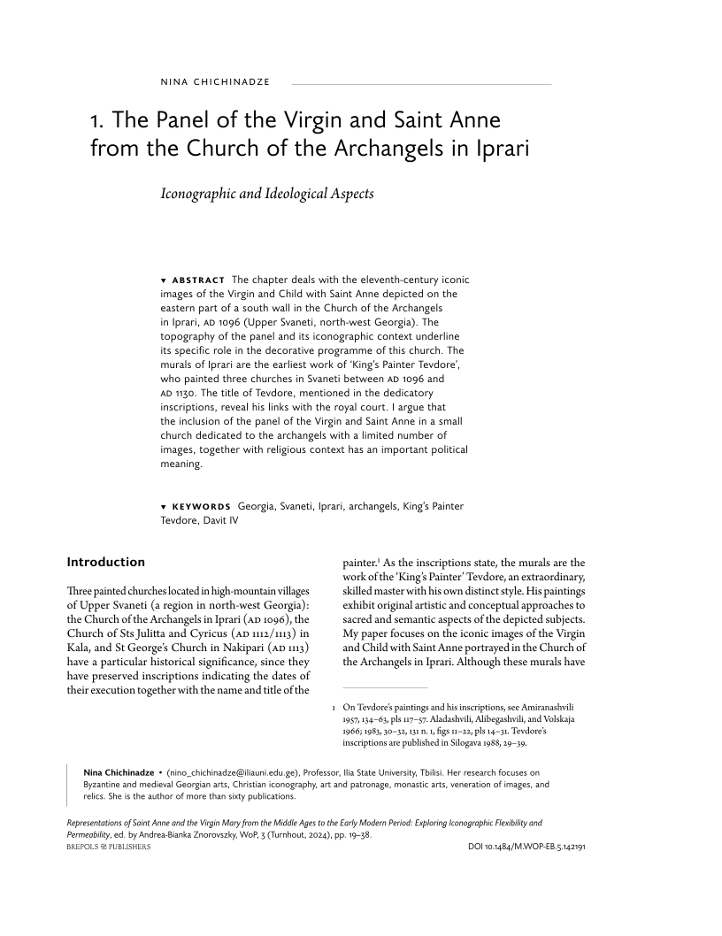 The chapter deals with the eleventh-century iconic images of the Virgin and Child with Saint Anne depicted on the eastern part of a south wall in the Church of the Archangels in Iprari, ad 1096 (Upper Svaneti, north-west Georgia). The topography of the panel and its iconographic context underline its specific role in the decorative programme of this church. The murals of Iprari are the earliest work of ‘King’s Painter Tevdore’, who painted three churches in Svaneti between ad 1096 and ad 1130. The title of Tevdore, mentioned in the dedicatory inscription, reveals his links with the royal court. I argue that the inclusion of the panel of the Virgin and Saint Anne in a small church dedicated to the archangels with a limited number of images, together with religious context has an important political meaning.