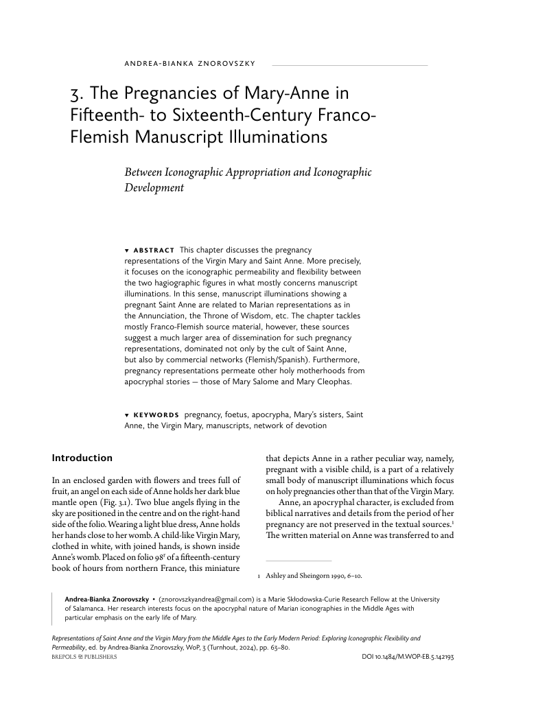 This chapter discusses the pregnancy representations of the Virgin Mary and Saint Anne. More precisely, it focuses on the iconographic permeability and flexibility between the two hagiographic figures in what mostly concerns manuscript illuminations. In this sense, manuscript illuminations showing a pregnant Saint Anne are related to Marian representations as in the Annunciation, the Throne of Wisdom, etc. The chapter tackles mostly Franco-Flemish source material, however, these sources suggest a much larger area of dissemination for such pregnancy representations, dominated not only by the cult of Saint Anne, but also by commercial networks (Flemish/Spanish). Furthermore, pregnancy representations permeate other holy motherhoods from apocryphal stories — those of Mary Salome and Mary Cleophas.
