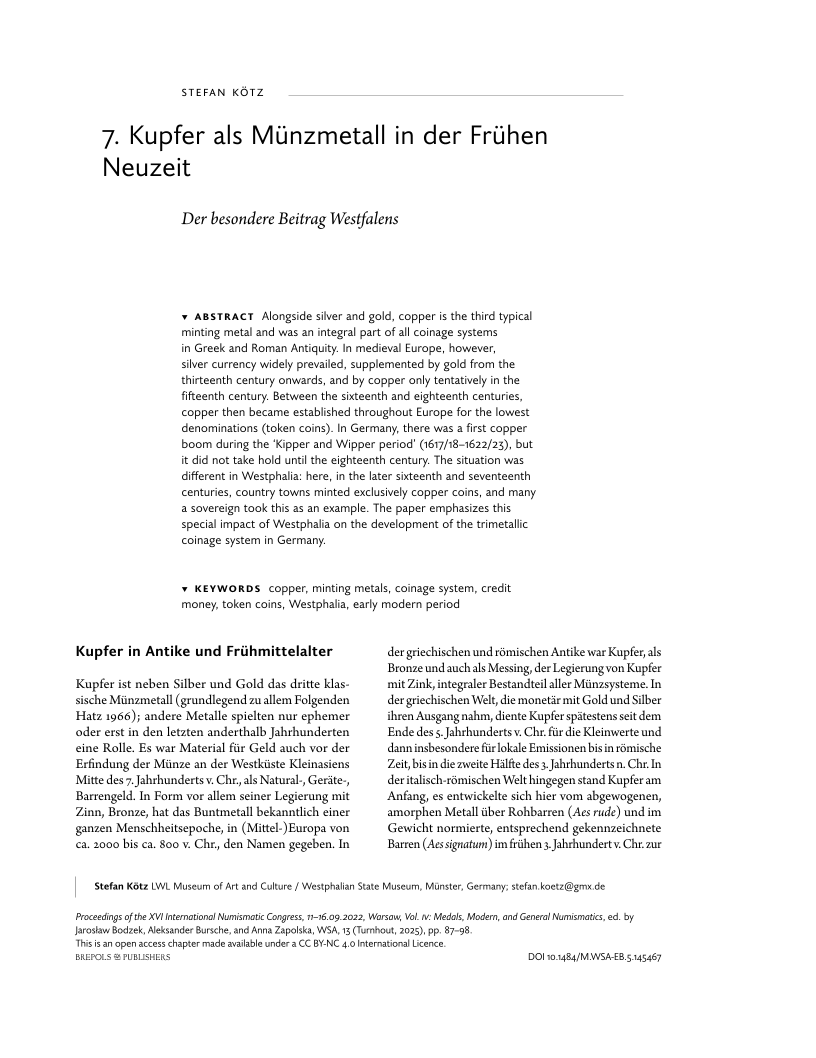 Alongside silver and gold, copper is the third typical minting metal and was an integral part of all coinage systems in Greek and Roman Antiquity. In medieval Europe, however, silver currency widely prevailed, supplemented by gold from the thirteenth century onwards, and by copper only tentatively in the fifteenth century. Between the sixteenth and eighteenth centuries, copper then became established throughout Europe for the lowest denominations (token coins). In Germany, there was a first copper boom during the ‘Kipper and Wipper period’ (1617/18–1622/23), but it did not take hold until the eighteenth century. The situation was different in Westphalia: here, in the later sixteenth and seventeenth centuries, country towns minted exclusively copper coins, and many a sovereign took this as an example. The paper emphasizes this special impact of Westphalia on the development of the trimetallic coinage system in Germany.