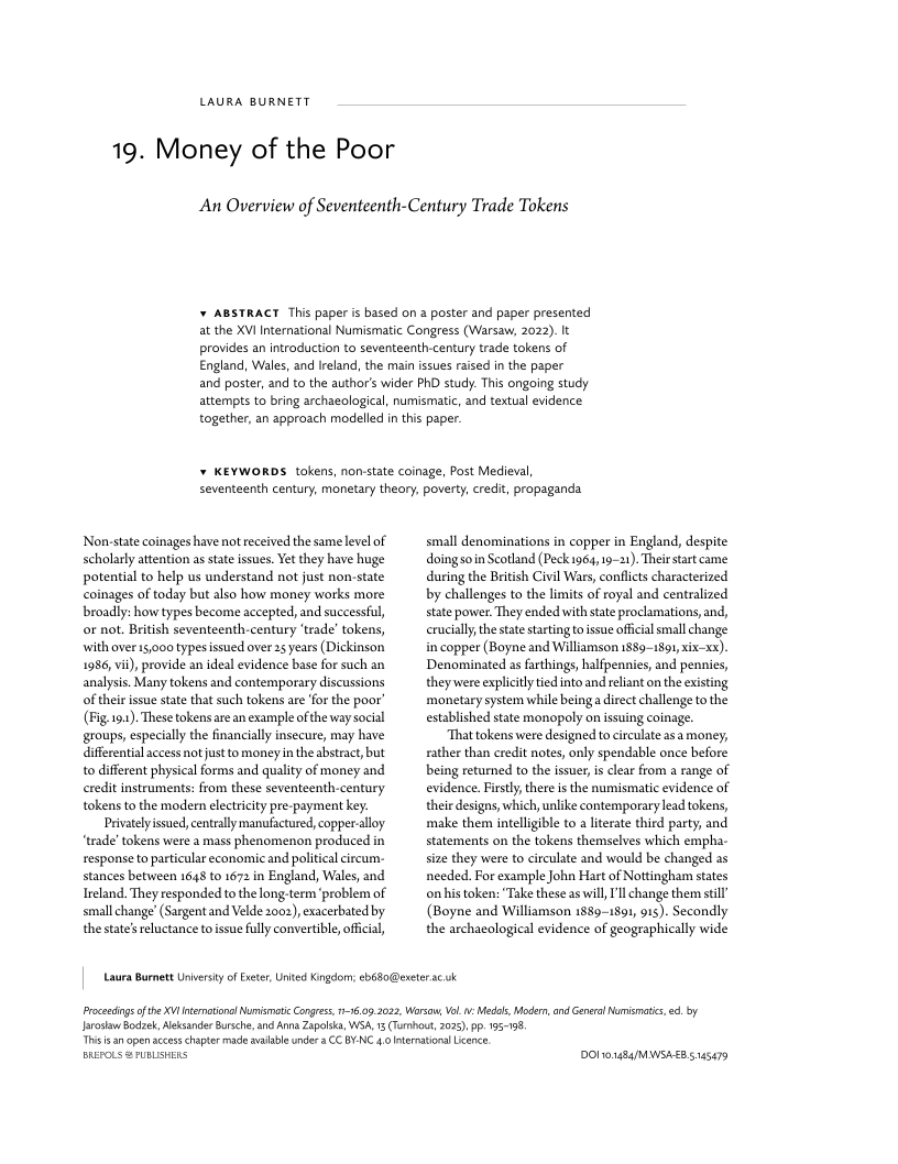 This paper is based on a poster and paper presented at the XVI International Numismatic Congress (Warsaw, 2022). It provides an introduction to seventeenth-century trade tokens of England, Wales, and Ireland, the main issues raised in the paper and poster, and to the author’s wider PhD study. This ongoing study attempts to bring archaeological, numismatic, and textual evidence together, an approach modelled in this paper.
