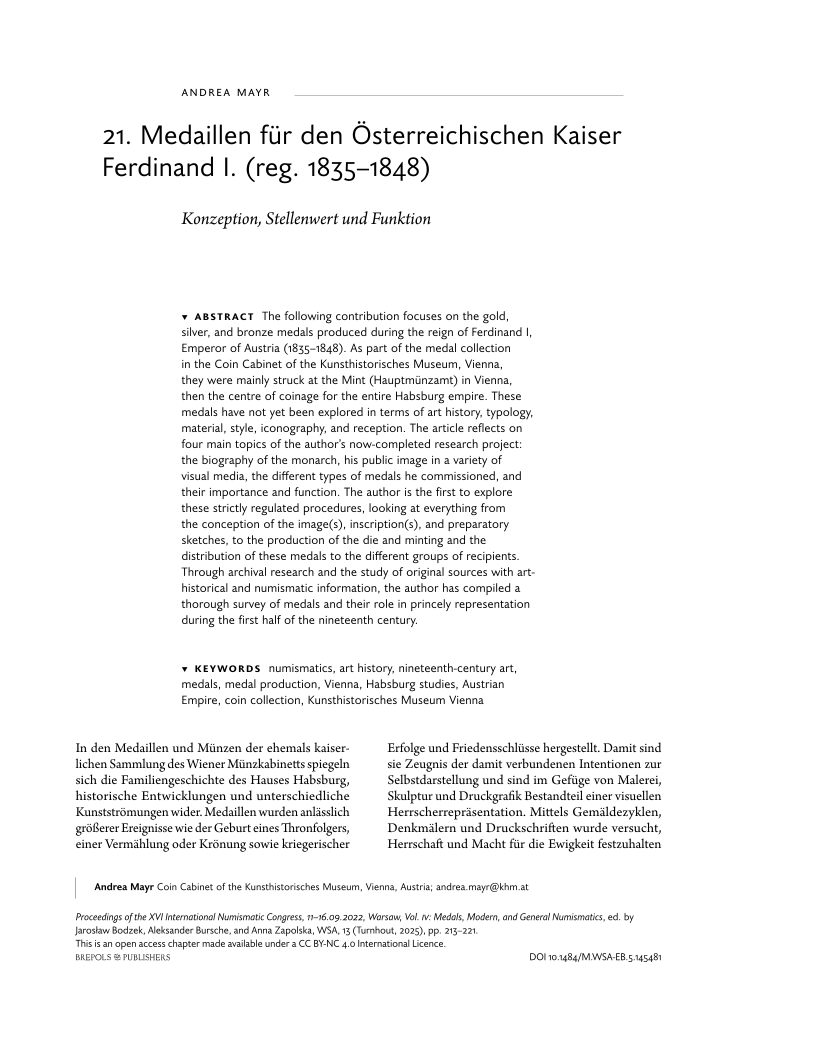 The following contribution focuses on the gold, silver, and bronze medals produced during the reign of Ferdinand I, Emperor of Austria (1835–1848). As part of the medal collection in the Coin Cabinet of the Kunsthistorisches Museum, Vienna, they were mainly struck at the Mint (Hauptmünzamt) in Vienna, then the centre of coinage for the entire Habsburg empire. These medals have not yet been explored in terms of art history, typology, material, style, iconography, and reception. The article reflects on four main topics of the author’s now-completed research project: the biography of the monarch, his public image in a variety of visual media, the different types of medals he commissioned, and their importance and function. The author is the first to explore these strictly regulated procedures, looking at everything from the conception of the image(s), inscription(s), and preparatory sketches, to the production of the die and minting and the distribution of these medals to the different groups of recipients. Through archival research and the study of original sources with art-historical and numismatic information, the author has compiled a thorough survey of medals and their role in princely representation during the first half of the nineteenth century.