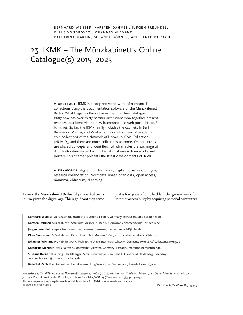 IKMK is a cooperative network of numismatic collections using the documentation software of the Münzkabinett Berlin. What began as the individual Berlin online catalogue in 2007 now has over thirty partner institutions who together present over 125,000 items via the new interconnected web portal ikmk.net. So far, the IKMK family includes the cabinets in Berlin, Brunswick, Vienna, and Winterthur, as well as over 40 academic coin collections of the Network of University Coin Collections (NUMiD), and there are more collections to come. Object entries use shared concepts and identifiers, which enables the exchange of data both internally and with international research networks and portals. This chapter presents the latest developments of IKMK.