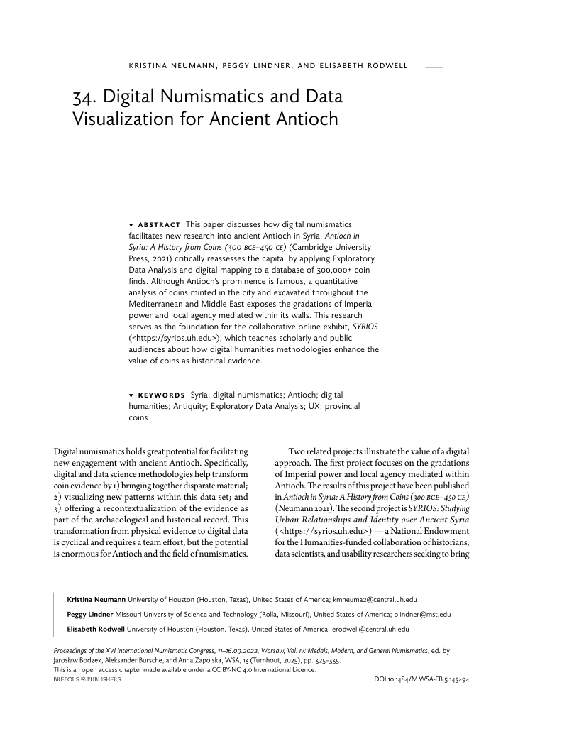 This paper discusses how digital numismatics facilitates new research into ancient Antioch in Syria. Antioch in Syria: A History from Coins (300 bce–450 ce) (Cambridge University Press, 2021) critically reassesses the capital by applying Exploratory Data Analysis and digital mapping to a database of 300,000+ coin finds. Although Antioch’s prominence is famous, a quantitative analysis of coins minted in the city and excavated throughout the Mediterranean and Middle East exposes the gradations of imperial power and local agency mediated within its walls. This research serves as the foundation for the collaborative online exhibit, SYRIOS (<https://syrios.uh.edu>), which teaches scholarly and public audiences about how digital humanities methodologies enhance the value of coins as historical evidence.