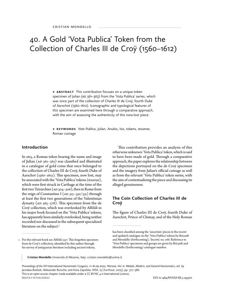 This contribution focuses on a unique token specimen of Julian (ad 361–363) from the ‘Vota Publica’ series, which was once part of the collection of Charles III de Croÿ, fourth Duke of Aarschot (1560–1612). Iconographic and typological features of this specimen are examined here through a comparative approach, with the aim of assessing the authenticity of this now-lost piece.