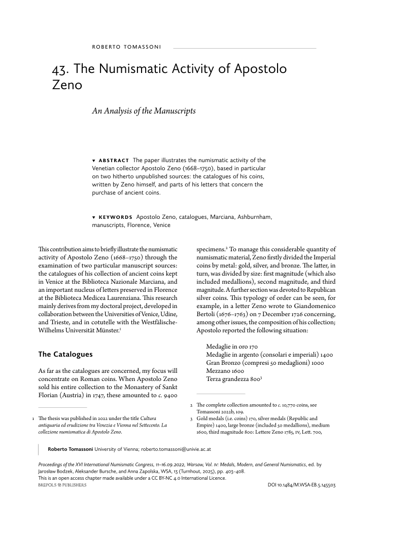 The Numismatic Activity of Apostolo Zeno. An Analysis of the Manuscripts, Page 1 of 1